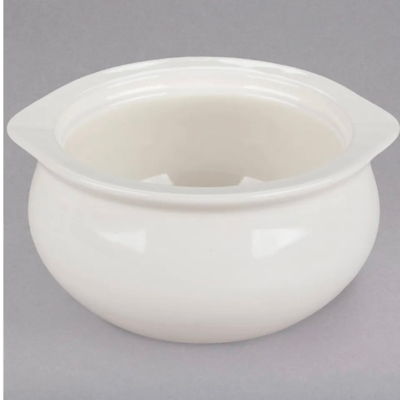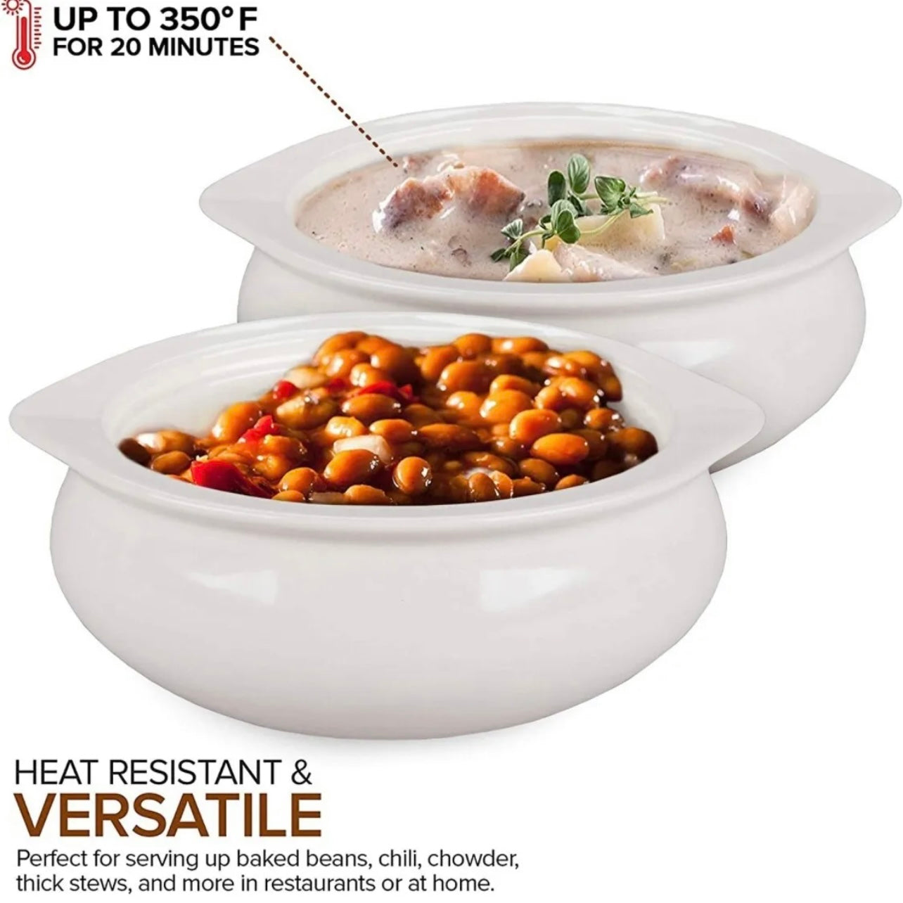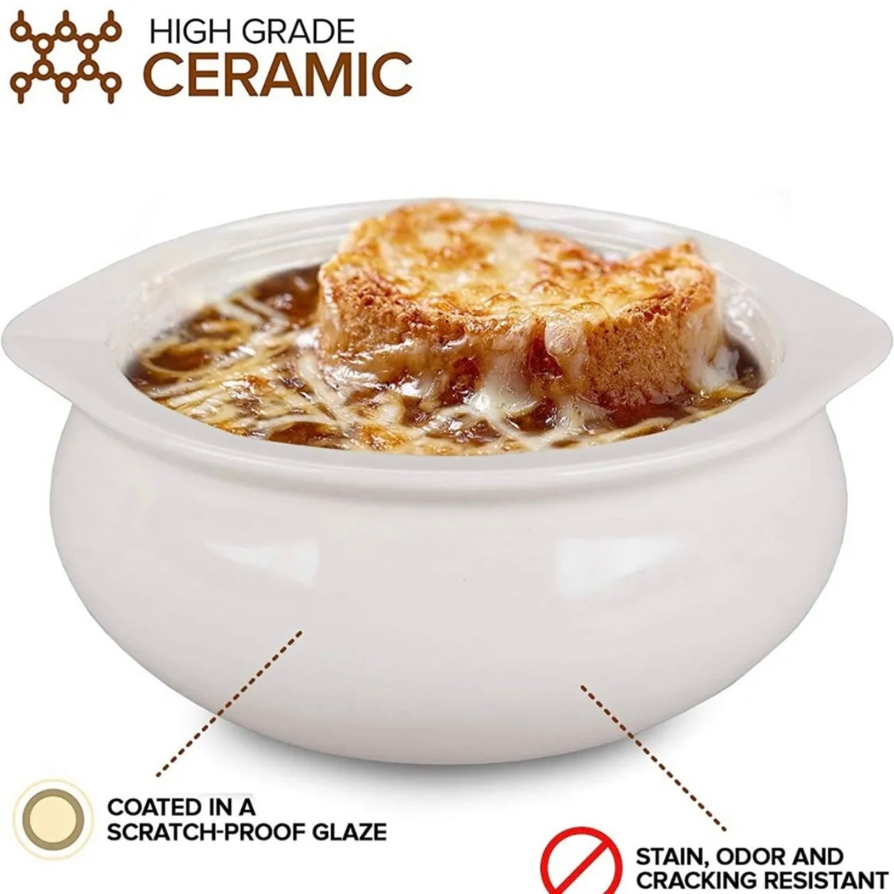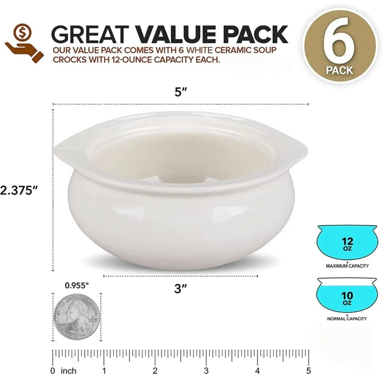 BBINGWARE Set of 4 French Onion Soup Crocks 12 oz White Ceramic Porcelain Bowls1. BBINGWARE Oven safe up to 350 degrees Fahrenheit for 20 minutes2. Fully vitrified to prevent moisture absorption3. Built-in handles help prevent burns4. Great for serving soups5.Perfect for Serving Up Baked Beans, Chili, Chowder, Thick Stews, and More in Restaurants or at Home!6.Our durable french onion soup crocks are dishwasher, microwave, oven, and freezer safe!7. Our french onion soup crocks are coated in a scratch-proof glaze. It is stain, odor and cracking resistant.Capacity: 12 ozDimension: top: 5 inch, Bottom: 3 inch, Height: 2.3/8 inchPackage included: 4 Bowls |